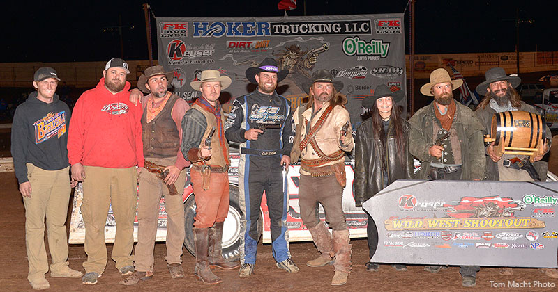 Cade Dillard got his first taste of Keyser Manufacturing Wild West Shootout presented by O’Reilly Auto Parts glory by racing to victory lane in the fifth of six rounds of the 13th Annual event on Saturday night atop the 1/3-mile FK Rod Ends Arizona Speedway clay oval.